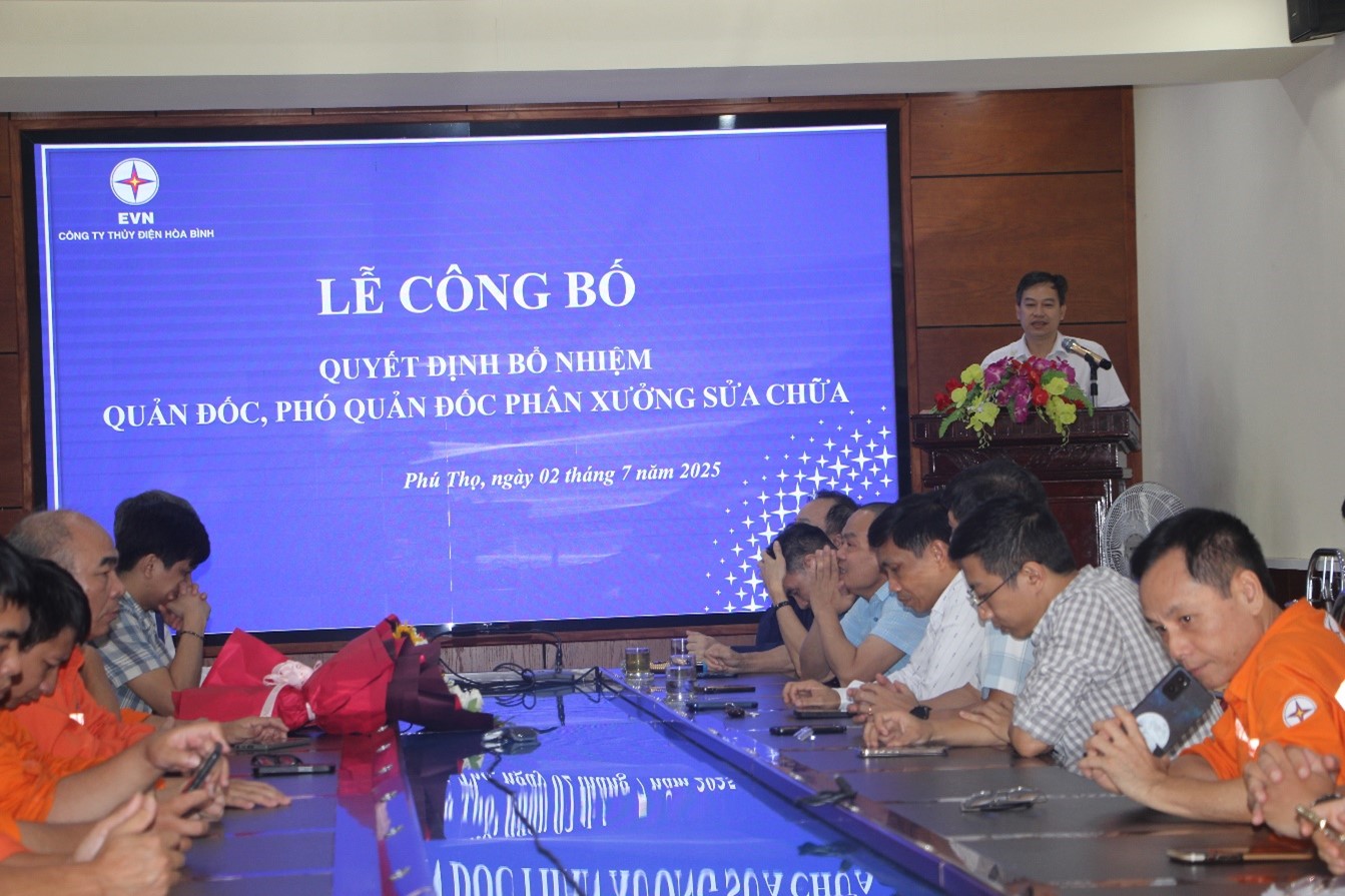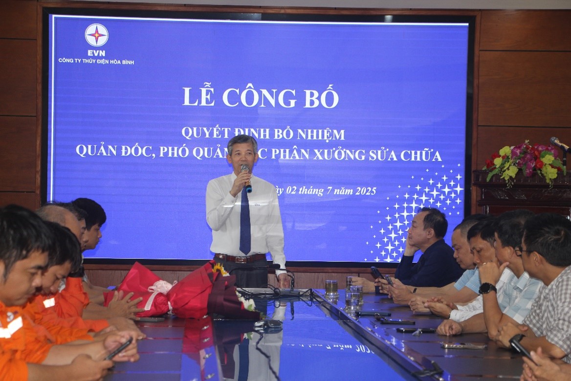 Ngày 02 tháng 7 năm 2025, Công ty Thủy điện Hòa Bình (Công ty) tổ chức “Công bố Quyết định thành lập và trao Quyết định bổ nhiệm cán bộ thuộc Phân xưởng Sửa chữa, Công ty Thủy điện Hòa Bình” theo tinh thần Nghị quyết số 163/NQ-HĐTV ngày 15/5/2025 của Hội đồng thành viên EVN về việc sắp xếp, tinh gọn tổ chức, bộ máy quản lý, điều hành của Công ty mẹ – EVN.