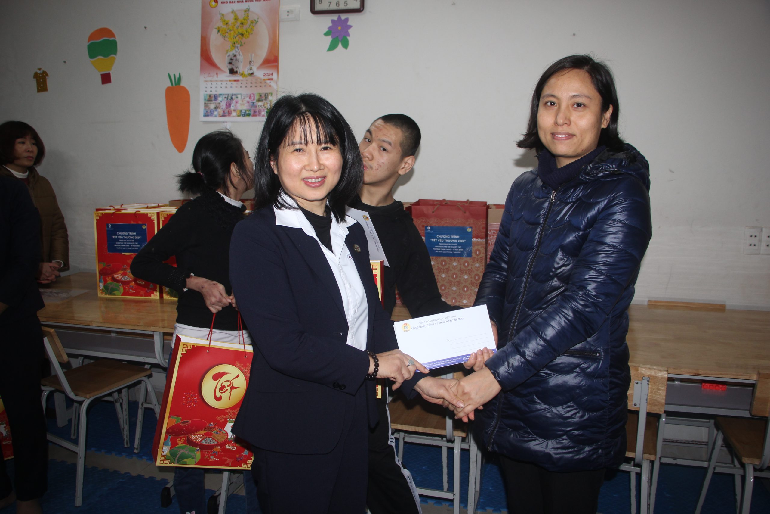 Bà Bùi Thị Hương, Trưởng Ban Nữ công Công ty Thủy điện Hòa Bình Trao quà cho cô giáo Lê Thị Chiến, phụ trách cơ sở khuyết tật
