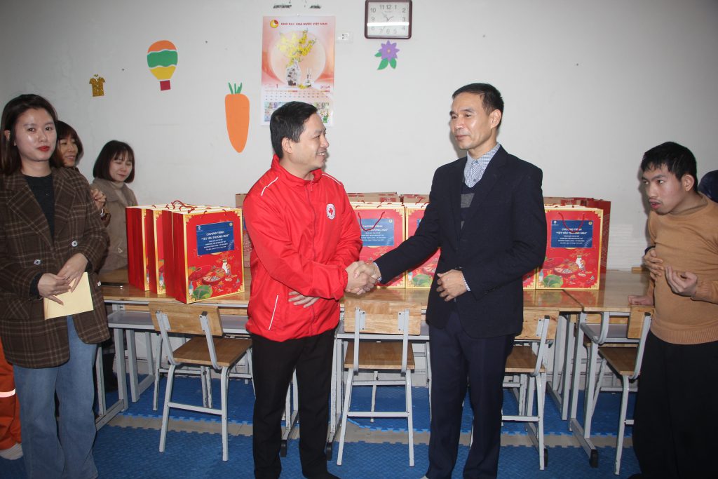 Ông Trần Văn Hòa, Phó Giám đốc-Chủ tịch Công đoàn Công ty Thủy điện Hòa Bình (bên phải); ông Dương Văn Giới, Phó Chủ tịch Hội chữ Thập đỏ thành phố Hòa Bình tại buổi tặng quà cho các cháu khuyết tật tại cơ sở giáo dục đặc biệt