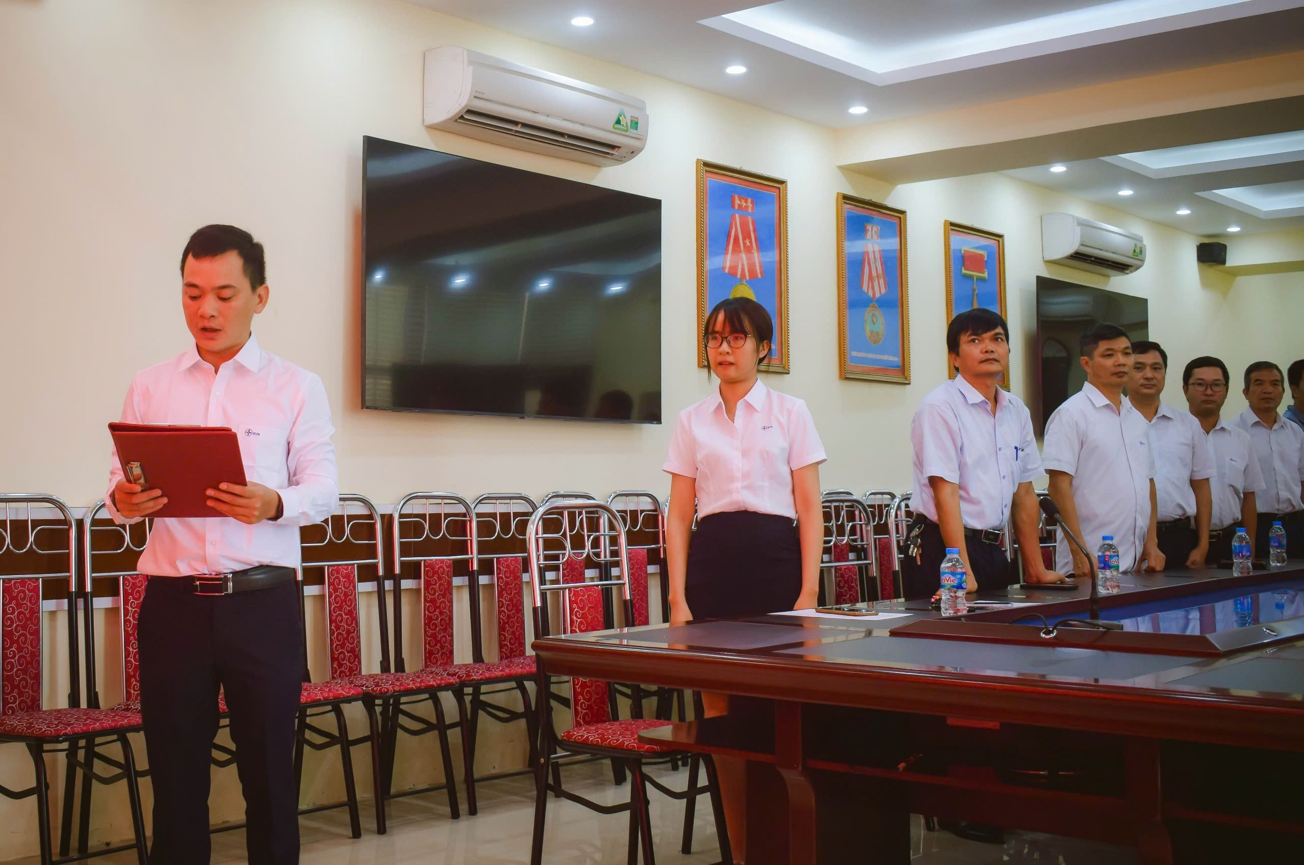 Dưới cờ Tổ quốc và chân dung Chủ tịch Hồ Chí Minh, đồng chí Vũ Thị Thanh Thủy và Nguyễn Khắc Thắng đã lần lượt đọc lời tuyên thệ và xin hứa phấn đấu không ngừng để hoàn thành nhiệm vụ của người đảng viên Đảng cộng sản Việt Nam.