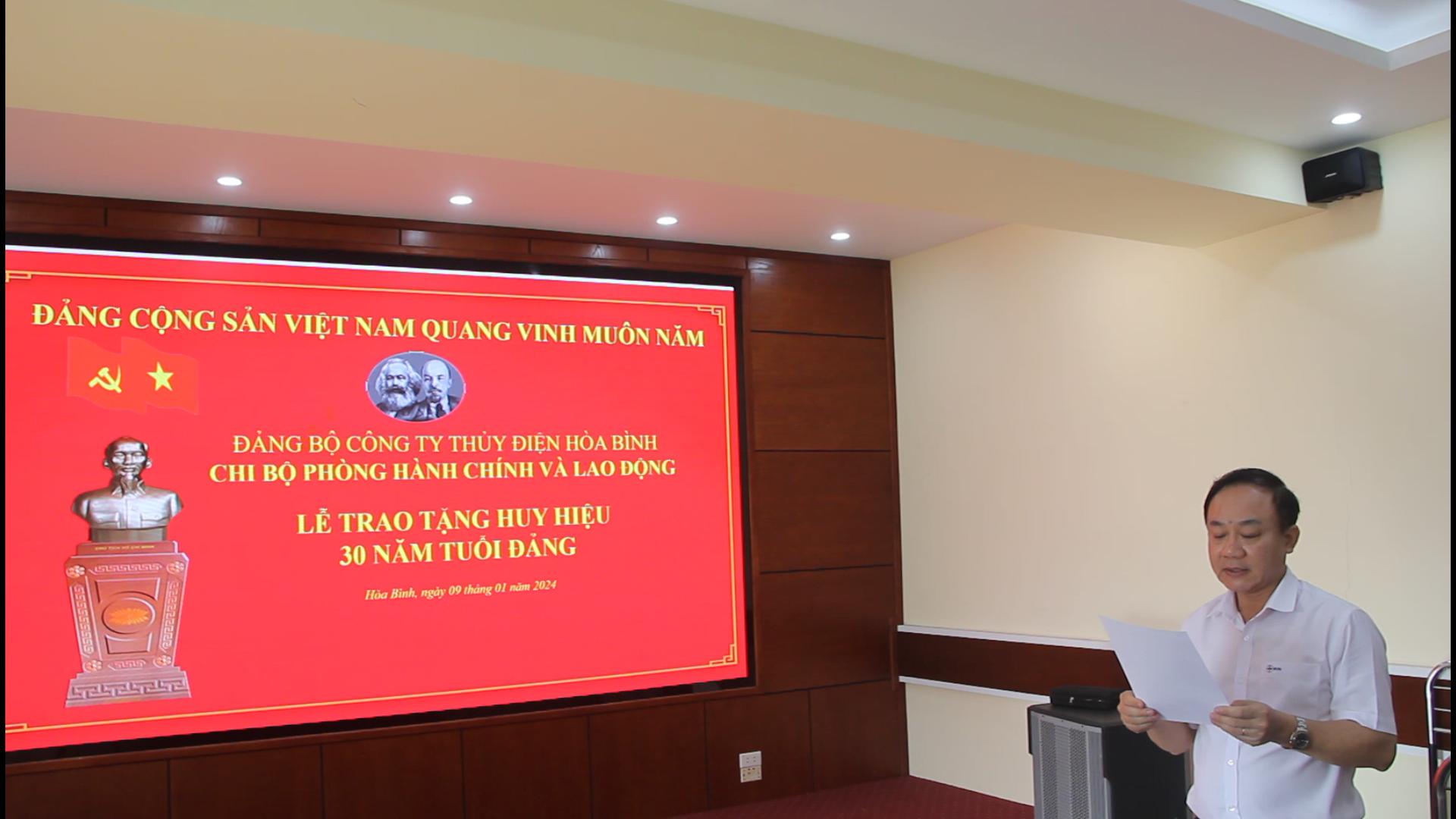 Nhân dịp đón năm mới 2024, Chi bộ Phòng Hành chính và Lao động Công ty Thủy điện Hòa Bình đã tổ chức Lễ trao tặng Huy hiệu 30 năm tuổi Đảng cho đồng chí Nguyễn Văn Phai – nhân viên Bảo vệ. Đồng chí Phạm Văn Vương – Ủy viên Ban chấp hành Đảng bộ Tập đoàn Điện lực Việt Nam, Bí thư Đảng ủy tới dự và chỉ đạo buổi Lễ.