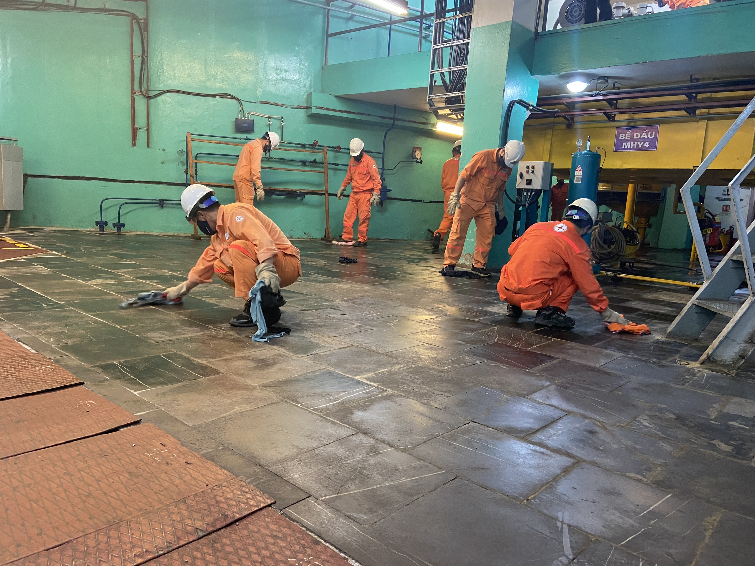 Sau khi triển khai dụng cụ trang bị bảo hộ cần thiết để phục vụ công tác và thống nhất phương án thực hiện, các ATVSV đã chia ra thành các nhóm khác nhau để tới từng khu vực được phân giao. Từng ngóc ngách nhỏ nhất được tỉ mỉ vệ sinh, dù ở dưới gầm thấp hay trần cao, những đôi bàn tay người thợ luôn cần mẫn thực hiện công việc của mình với tinh thần không quản ngại khó khăn, để cùng nhau hoàn thành nhiệm vụ được giao phó. Đặc biệt, việc giữ An toàn lao động, phòng chống cháy nổ trong khi thực hiện công việc luôn được các ATVSV đặt lên hàng đầu, vì đa số các khu vực, thiết bị được vệ sinh đều có nhiều thiết bị điện cao áp, đường ống khí áp lực cao, hệ thống dầu… tiềm ẩn nhiều mối nguy.