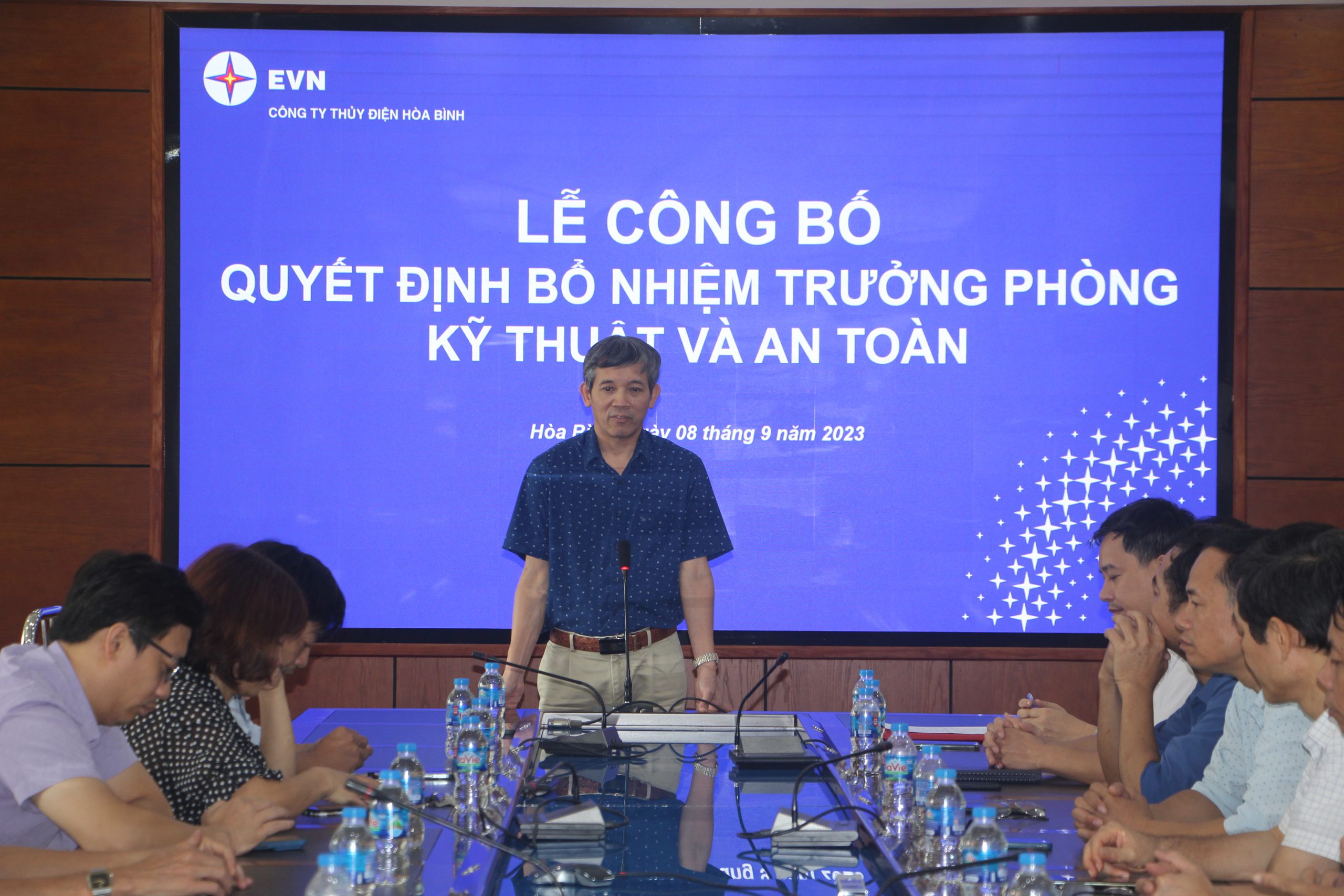 Tại buổi lễ, ông Trần Văn Tuấn, Trưởng phòng Hành chính và Lao động công bố Quyết định của Giám đốc Công ty Thủy điện Hòa Bình, về việc bổ nhiệm ông Phùng Việt Cường đảm nhận chức vụ Trưởng phòng Kỹ thuật và An toàn kể từ ngày 01 tháng 9 năm 2023.