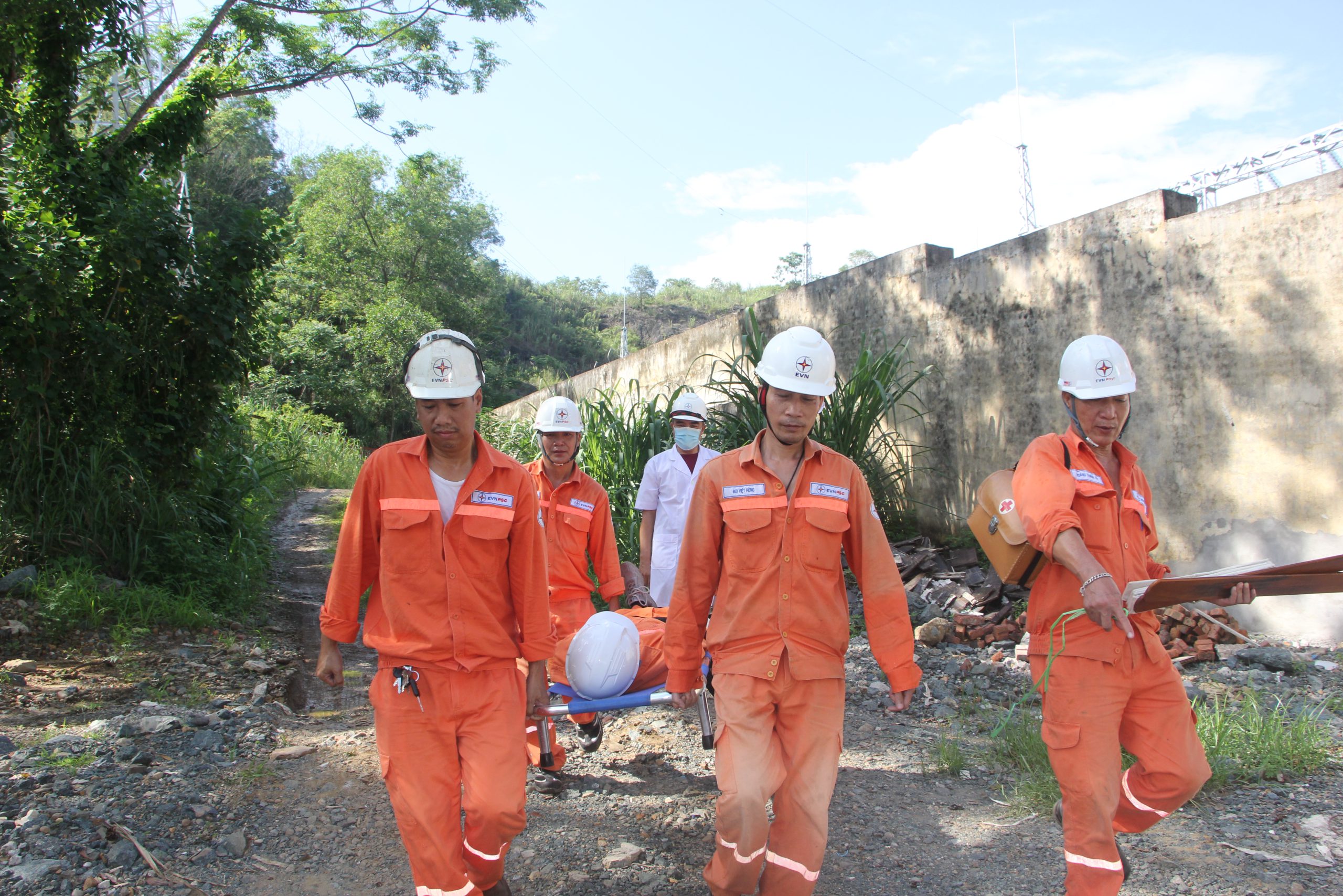 Tiếng loa từ ông Nguyễn Đức Trang chỉ huy các nhóm, như chìm trong tiếng máy xúc, mọi người khẩn chương tham gia thực hiện công việc được giao với tinh thần như đang thực hiện cứu hộ, cứu nạn chứ không phải đang diễn tập. Khi lực lượng máy xúc đã thu dọn hết phần đất đá sát chân tường, thì phát hiện đường cáp Quang bị đứt, tổ kỹ thuật với 4 người đã nhanh chóng tiếp cận hiện trường đưa sợi cáp quang bị đứt lên khỏi rãnh và thực hiện các bước kỹ thuật để nối. Với tình huống giả định một công nhân trong quá trình tham gia đã bị ngã do trơn trượt, sau khi nghe tiếng hô có người bị ngã, nhóm công tác đã nhanh chóng cõng người bị nạn ra khỏi phạm vi và bộ phận trực Y tế đã tới kịp thời để đưa nạn nhân ra ngoài cứu chữa.
