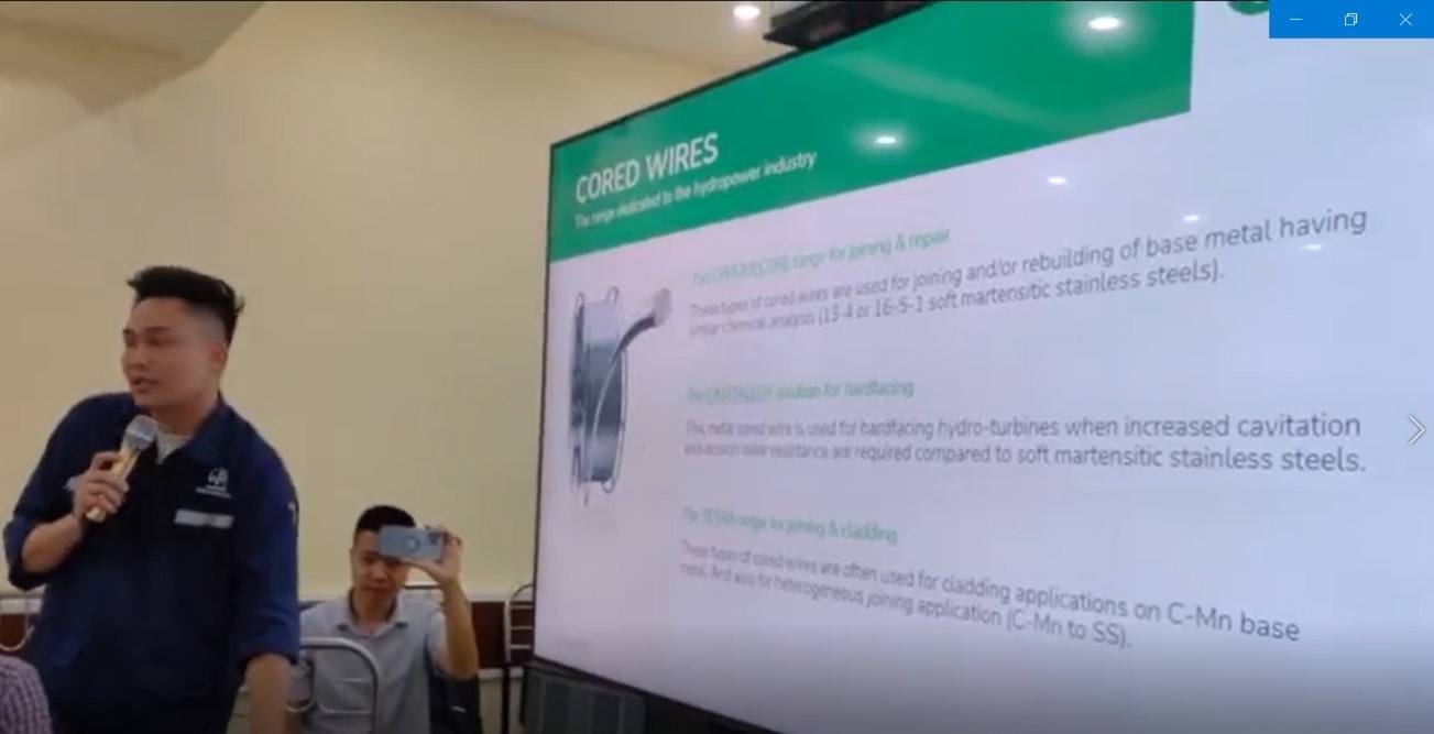 - Hãng Welding Alloys (WAG) trình bày chuyên đề “Kinh nghiệm và giải pháp của WAG trong nghiên cứu, chế tạo vật liệu hàn đặc chủng và công nghệ phục hồi bánh xe công tác thủy điện – Ứng dụng thực tiễn tại Âu Mỹ và đánh giá trường hợp bánh xe công tác của nhà máy thủy điện Hòa Bình”. WAG đã giới thiệu chi tiết về dải sản phẩm CHROMECORE – các loại dây hàn lõi thuốc (Flux-Cored Wire – FCW) đặc chủng như CHROMECORE M 410NiMo-G, CHROMECORE B 13 4-G, và CHROMECORE V 410NiMo-G. Đây không chỉ là những vật liệu hàn thông thường, mà là kết quả của quá trình nghiên cứu, chế tạo công phu, được tối ưu hóa để chống chịu xâm thực, mài mòn và phục hồi các vết nứt sâu trên các vật liệu thép không gỉ cao cấp của BXCT. Một trong những điểm nổi bật nhất mà WAG trình bày là phân tích chuyên sâu về hành vi hàn trong các thử nghiệm ở vị trí phẳng và đặc biệt là vị trí thẳng đứng từ dưới lên (Vertical up position) – một thách thức lớn trong công tác sửa chữa tại hiện trường. WAG đã cung cấp các thông số kỹ thuật chi tiết như tốc độ cấp dây (Wfs), điện áp (U), dòng điện (I), và tốc độ di chuyển (Ts) cho từng loại dây CHROMECORE ở vị trí hàn khó khăn này. Điều này chứng tỏ khả năng ứng dụng thực tiễn vượt trội của công nghệ WAG, cho phép các thợ hàn thực hiện công việc với độ chính xác và chất lượng cao ngay cả trong điều kiện phức tạp. Đặc biệt, WAG đã gây ấn tượng mạnh với việc tăng tốc độ lắng đọng (Deposition rate) lên đến +40%. Con số này không chỉ là một cải tiến kỹ thuật mà còn mang lại ý nghĩa kinh tế to lớn.