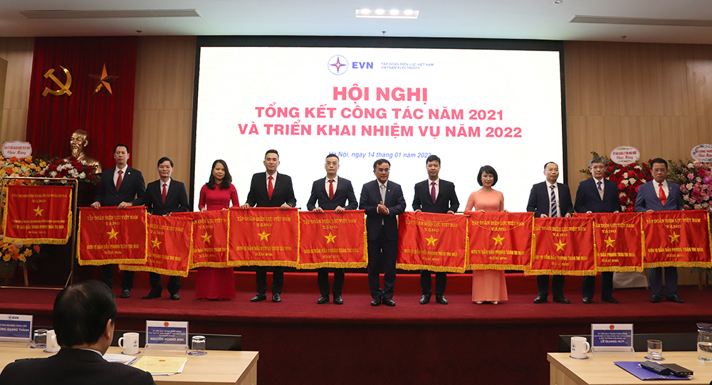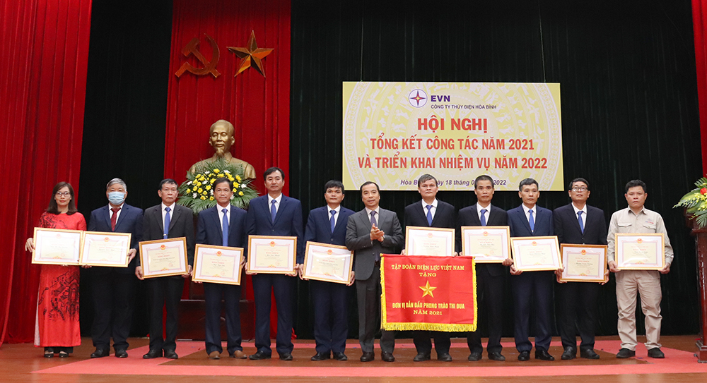 Ông Phạm Văn Vương – Giám đốc Công ty Thủy điện Hòa Bình (thứ 2 từ phải sang) nhận Cờ thi đua của EVN cho đơn vị dẫn đầu phong trào thi đua năm 2021 tại Hội nghị tổng kết công tác năm 2021 của EVN, ngày 14/1/2022.