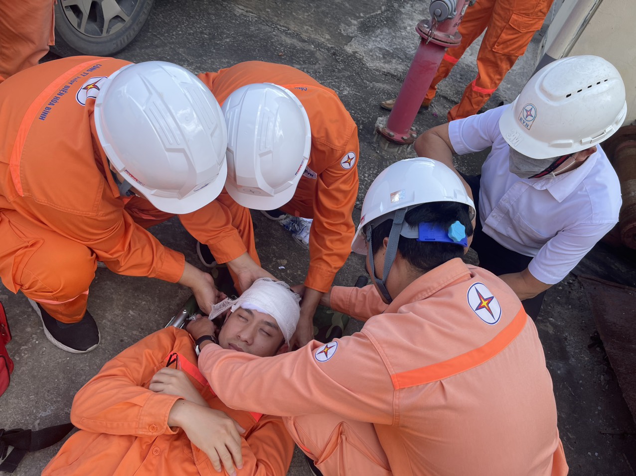 Với tình huống giả định một công nhân trong quá trình tham gia làm việc đã bị ngã do sàn nhà trơn trượt, sau khi nghe tiếng hô có người bị ngã, nhóm công tác đã nhanh chóng đưa cáng cứu thương vào để đưa người bị nạn ra khỏi phạm vi, bộ phận Y tế đã nhanh chóng có mặt để sơ cứu kịp thời và kiểm tra xác định tình trạng sức khỏe nạn nhân, nếu cần thiết chuyển tới bệnh viện.