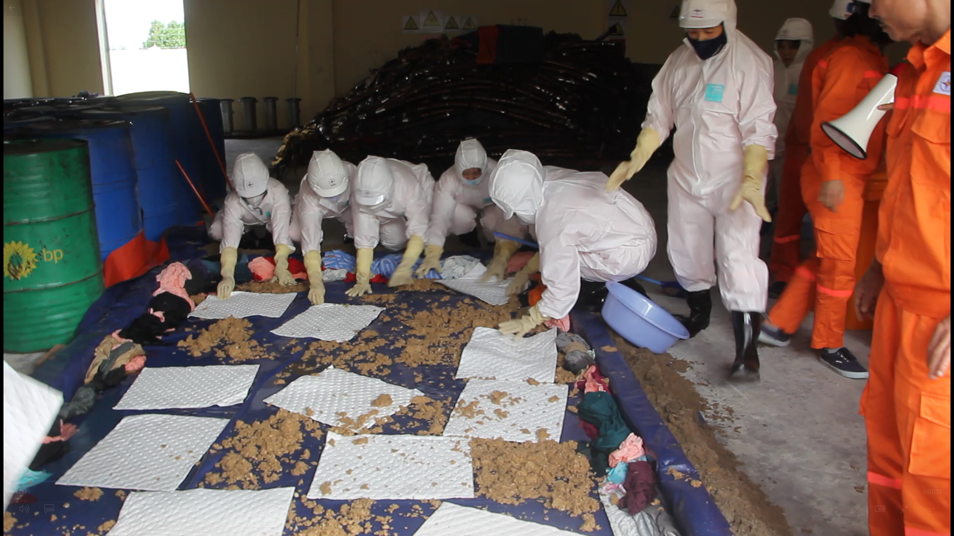 Việc xử lý khắc phục dầu tràn được diễn ra theo đúng trình tự các bước, đó là sau khi đã được ngăn chặn bằng cát và giẻ lau, bông hút dầu được rải xuống khu vực dầu, loại bông chuyên dụng này có chức năng hút dầu, phần dầu còn lại sẽ dùng giấy thấm để làm sạch, sau đó được thu gom vào các tùng chứa có nắp đậy rồi di chuyển vào các khoang chứa tại khu vực kho lưu trữ chất thải nguy hại.