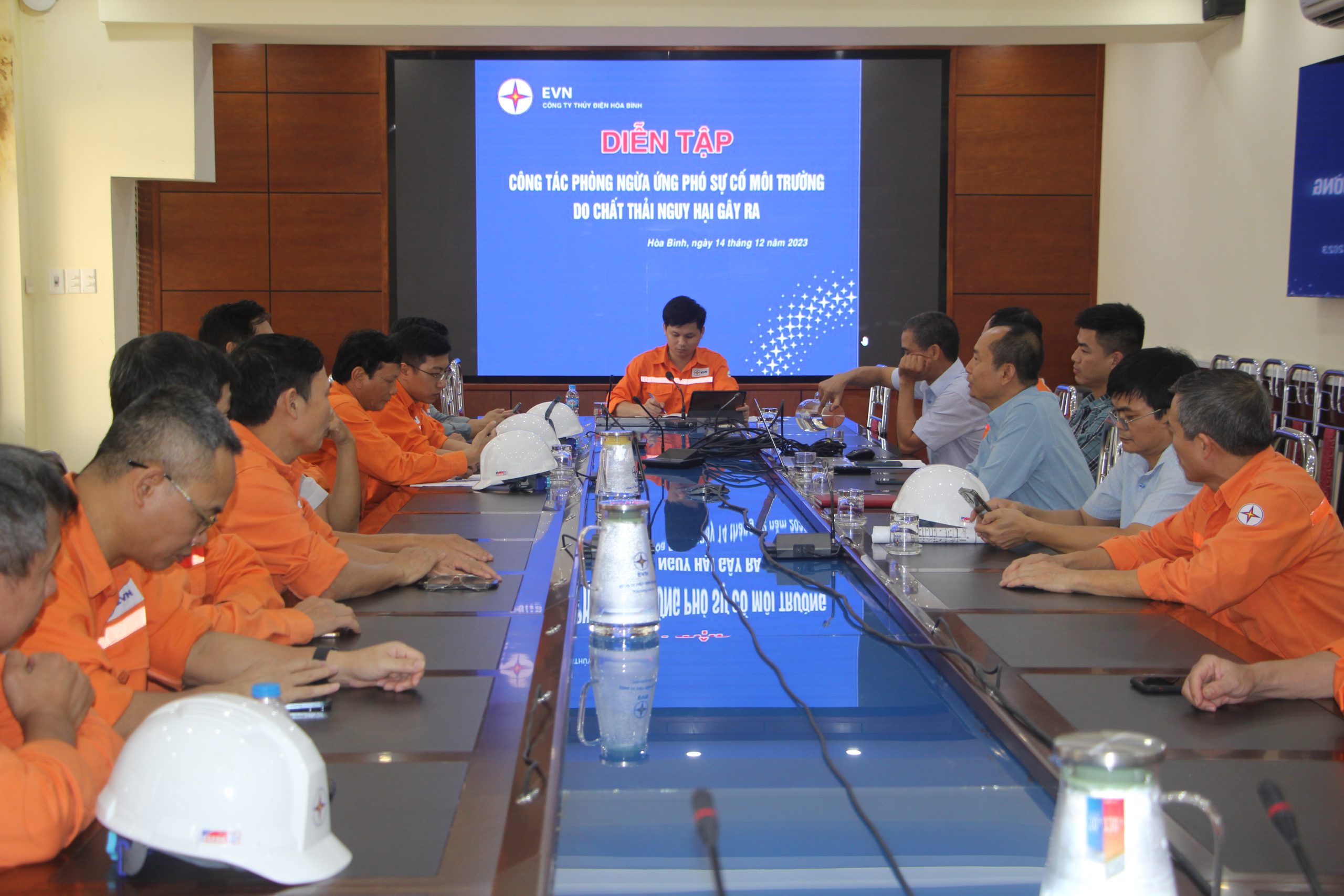 Chiều ngày 14/12/2023 Công ty Thủy điện Hòa Bình đã tổ chức diễn tập công tác phòng ngừa ứng phó sự cố môi trường do chất thải nguy hại gây ra tại kho chứa chất thải của Công ty.