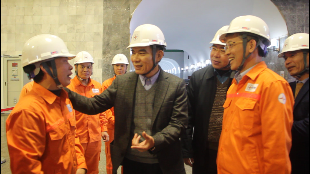 Ông Nguyễn Hữu Tuấn, Phó Bí thư Thường trực EVN (đứng trước) ông Đỗ Đức Hùng Chủ tịch Công đoàn EVN (đứng phía sau) thăm và tặng quà NLĐ Công ty Thủy điện Hòa Bình nhân dịp Xuân Giáp Thìn 2024