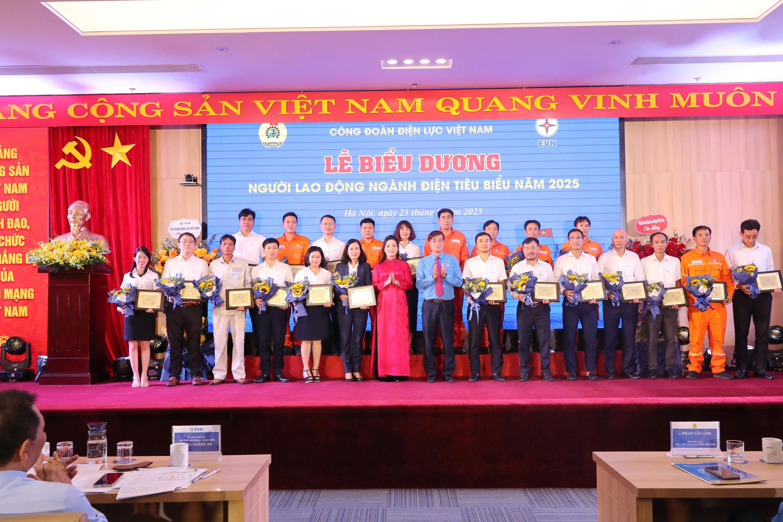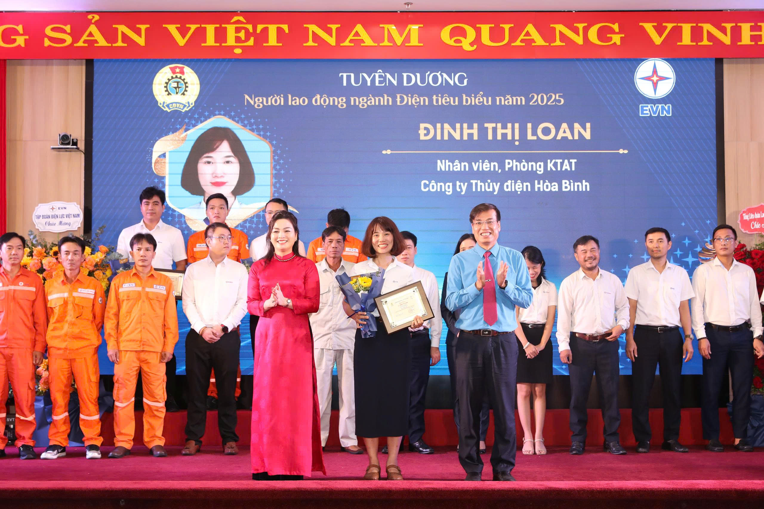 Chiều ngày 23/5, tại Hội trường EVN, Công đoàn Điện lực Việt Nam và Tập đoàn Điện lực Việt Nam tổ chức Lễ biểu dương “Người lao động ngành Điện tiêu biểu” và Diễn đàn “Đảng với công nhân – Công nhân với Đảng” năm 2025. Tại buổi lễ biểu dương đã vinh danh 117 cá nhân xuất sắc là người lao động trực tiếp tại các đơn vị trong Tập đoàn trong đó Công ty Thủy điện Hòa Bình vinh dự có 01 cá nhân tiêu biểu là đồng chí Đinh Thị Loan nhân viên Phòng Kỹ thuật và An toàn.