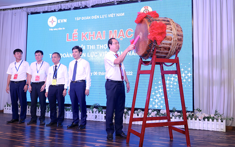 Các đại biểu thực hiện nghi thức khai mạc Hội thi Thợ giỏi Tập đoàn Điện lực Việt Nam năm 2022. Trong ảnh, ông Đỗ Đức Hùng – Chủ tịch Công đoàn Điện lực Việt Nam đánh trống khai mạc hội thi.