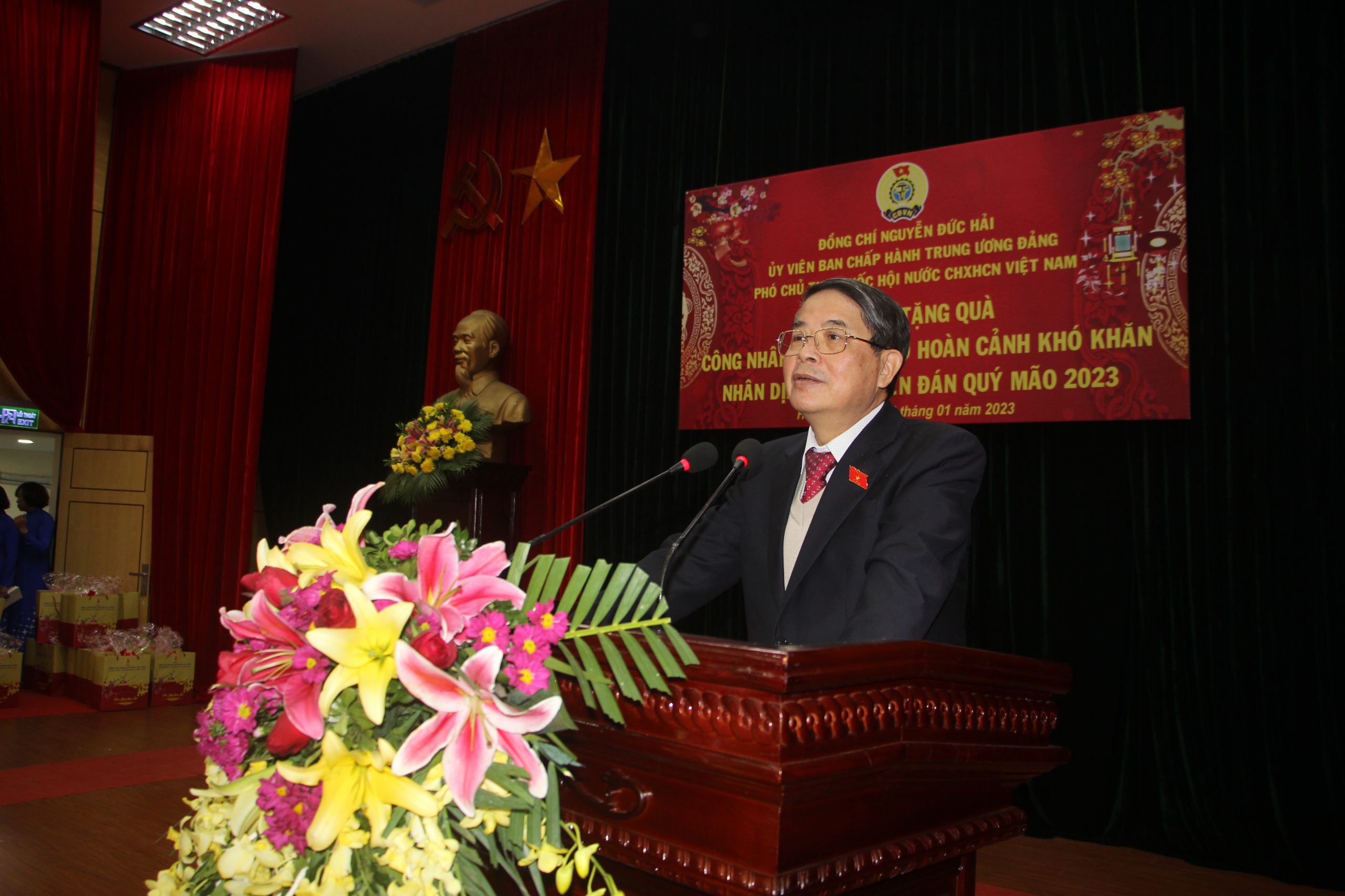 Phó Chủ tịch Quốc hội Nguyễn Đức Hải phát biểu tại buổi thăm và chúc tết công nhân lao động có hoàn cảnh khó khăn trên địa bàn tỉnh Hòa Bình