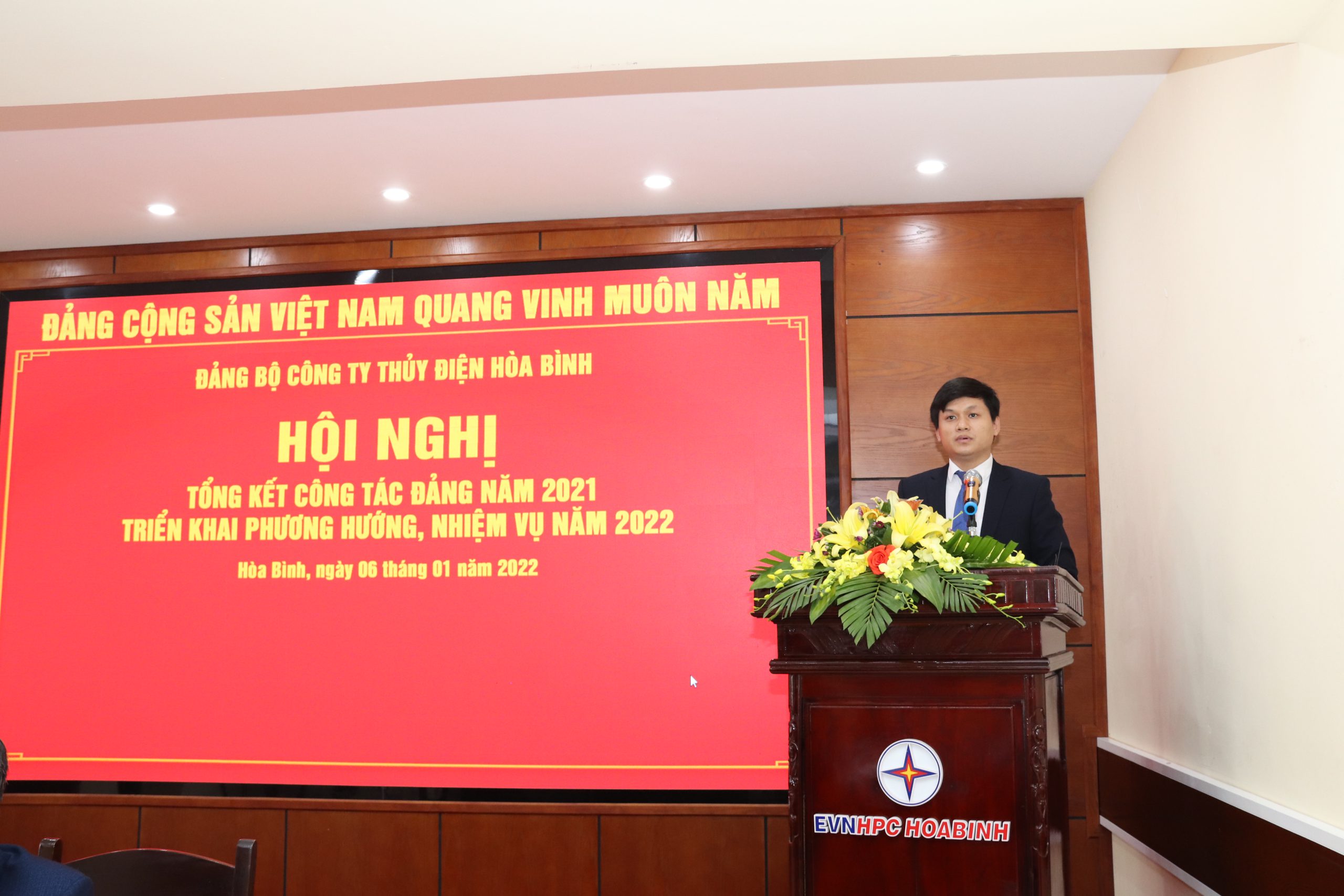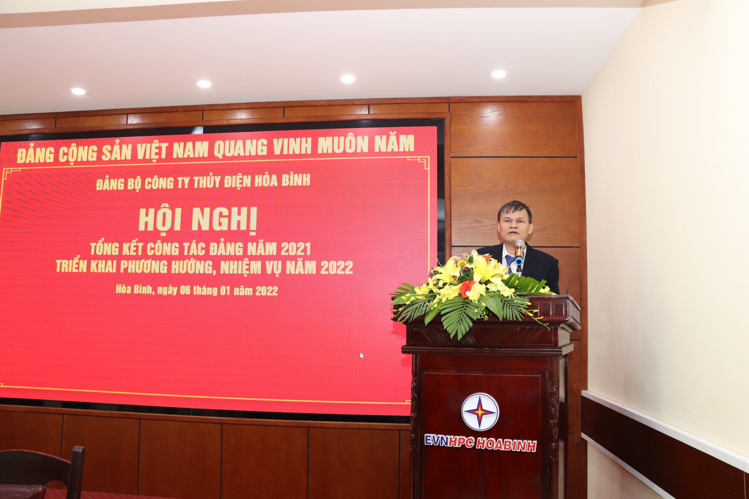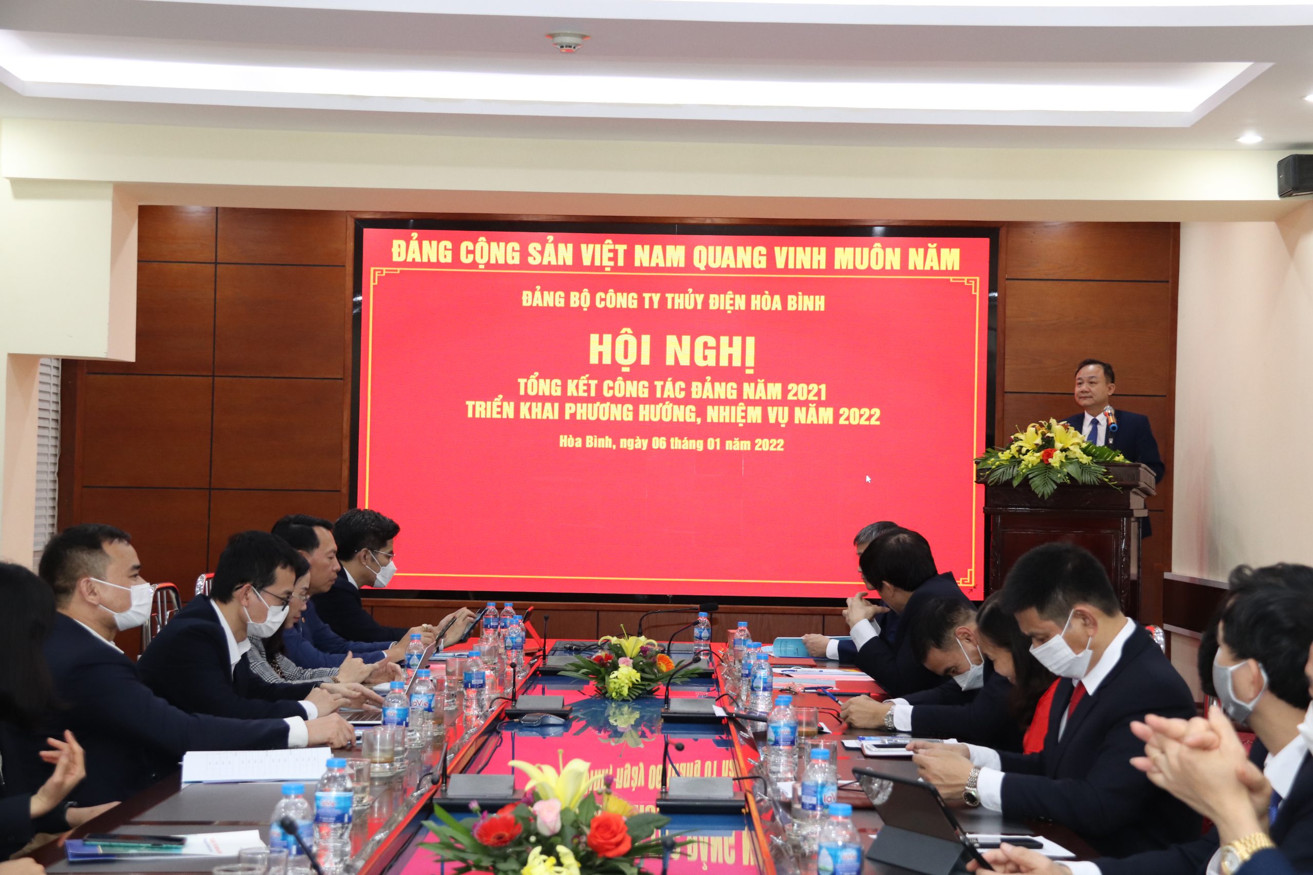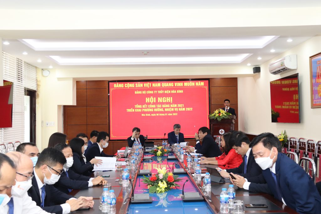 Hội nghị đã nghe báo cáo tổng kết công tác năm 2021 và triển khai phương hướng, nhiệm vụ năm 2022 do đồng chí Phạm Văn Vương, Bí thư Đảng ủy trình bày. Báo cáo nêu rõ Đảng bộ Công ty thủy điện Hòa Bình đã lãnh đạo, chỉ đạo thực hiện nhiệm vụ, kế hoạch năm 2021 trong bối cảnh không ít khó khăn, thách thức do diễn biến thủy văn không thuận lợi; lượng nước về hồ chỉ đạt 69% so với trung bình nhiều năm; dịch bệnh Covid-19 diễn biến phức tạp, kéo dài làm ảnh hưởng rất nhiều đến hoạt động sản xuất của Công ty; Nhờ sự chỉ đạo sát sao của Đảng ủy Tập đoàn; tinh thần đoàn kết thống nhất cao và bề dày kinh nghiệm trong quản lý vận hành của cán bộ lãnh đạo và người lao động của Công ty nên các mục tiêu kế hoạch năm 2021 đã cơ bản được hoàn thành. Báo cáo cũng đưa ra phương hướng, nhiệm vụ năm 2022 với các mục tiêu, chỉ tiêu cụ thể như: Bồi dưỡng, kết nạp 03 đảng viên, trong đó có ít nhất 01 đảng viên mới là đoàn viên thanh niên; 100% các tổ chức đảng hoàn thành tốt nhiệm vụ; trên 90% đảng viên “Hoàn thành tốt nhiệm vụ”, không có đảng viên “Không hoàn thành nhiệm vụ”; Sản xuất điện đạt sản lượng 8,718 tỷ KWh; Hoàn thành các chỉ tiêu kinh tế – kỹ thuật Tập đoàn giao.